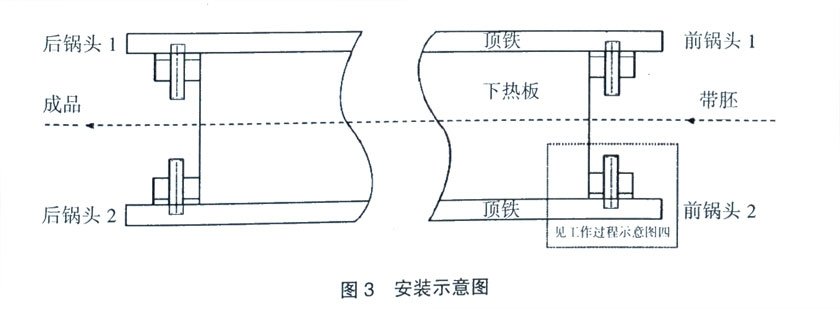 將制作完成的4套連接固定裝置,分別置于前“鍋”頭前后的4個(gè)位置,上下用螺栓連接固定。為避免輸送帶帶體拉出時(shí),前“鍋”頭2末端對(duì)帶體產(chǎn)生劃痕,前“鍋”頭2上端需與下加熱平板保持平行,并低于下加熱平板上頂面2~ 5mm。安裝示意圖見圖3。
