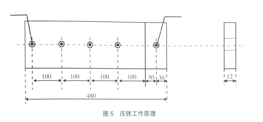 運(yùn)行過程中發(fā)現(xiàn)一個(gè)問題,當(dāng)輸送帶的規(guī)格品種變化時(shí),需要更換與該規(guī)格厚度和寬度相對(duì)應(yīng)的墊鐵,這個(gè)過程比較麻煩,需要拆裝大量的螺栓。在實(shí)踐過程中,為配合不同規(guī)格產(chǎn)品的生產(chǎn),筆者以自制加工的壓鐵解決了上述難題以帶寬1000mm產(chǎn)品生產(chǎn)為例,壓鐵工作原理設(shè)計(jì)圖見圖5。