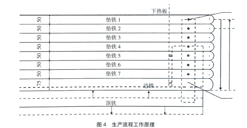 在這個(gè)過程中,操作人員身體必須全部貼身靠近4個(gè)“鍋”頭,靠腕力將重達(dá)35kg~100kg、厚度不同的墊鐵來回翻動(dòng)。每天要重復(fù)翻動(dòng)幾十次,一般人體力無法堅(jiān)持。傳統(tǒng)的硫化沒備最長(zhǎng)達(dá)18m,墊鐵長(zhǎng)度更長(zhǎng)、更重。最小行程為0mm。生產(chǎn)過程中,可以利用頂鐵進(jìn)出帶動(dòng)墊鐵進(jìn)出,即將頂鐵與靠近輸送帶帶體的墊鐵連接并固定,就可實(shí)現(xiàn)墊鐵自動(dòng)進(jìn)退,無需手工翻動(dòng)。